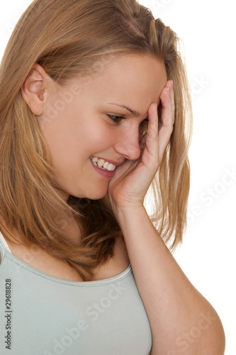 Junge freundliche Frau hält sich die Hand vors Gesicht