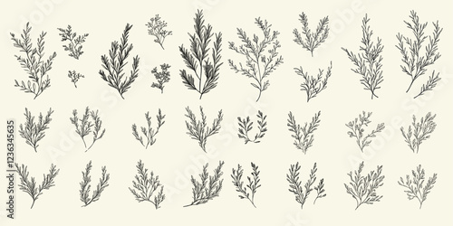 Juniper floral branch set, elegant hand-drawn winter wedding herb, rustic trendy greenery, logo for save the date invitation.