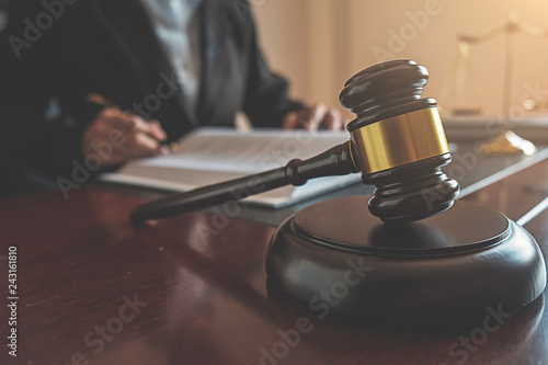 Justice and Law concept. Legal counsel presents to the client a signed contract with gavel and legal law or legal having team meeting at law firm in background