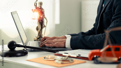 Justice court judge using hammer and red toy car. Traffic and driving law concept. Car accident. Drunk driving legal case. Close up.