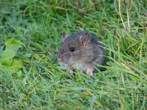 Juvenile common rat (Rattus norvegicus) with dark grey fur sitting in the green grass in bright sunlight