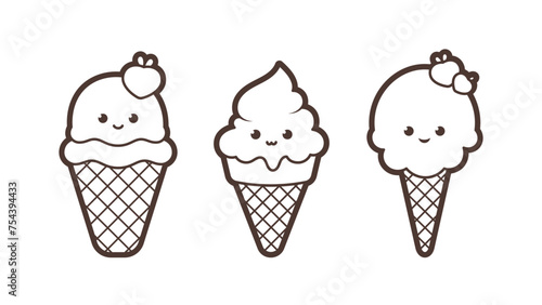 Kawaii ice cream dessert in a waffle cup, black outline, vector illustration in cartoon style. Vector illustration