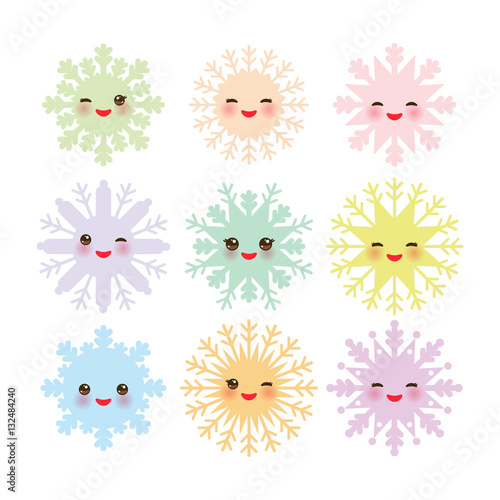 Kawaii snowflake set blue mint orange pink lilac funny face with eyes and pink cheeks on white background. Vector