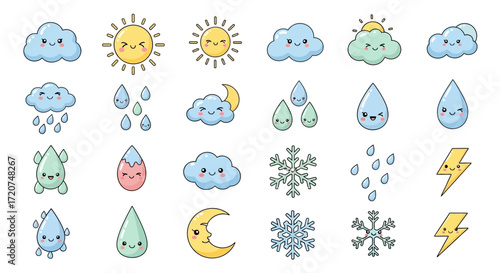 Kawaii weather icons: sun, clouds, rain, snow, moon, lightning.