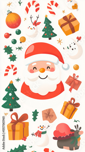 Kawaii-style holiday icons such as a smiling Santa Claus, a happy snowman, and a cute reindeer, surrounded by festive elements like gifts, candy canes, and Christmas trees