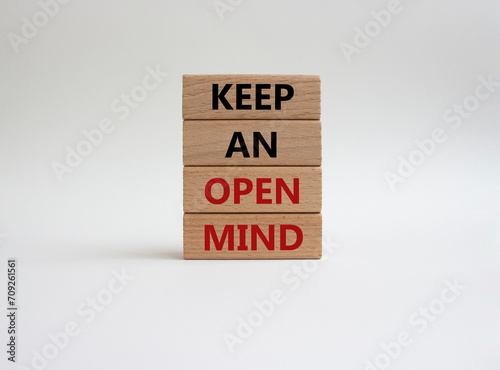 Keep an open mind symbol. Wooden blocks with words Keep an open mind. Beautiful white background. Business and Keep an open mind concept. Copy space.