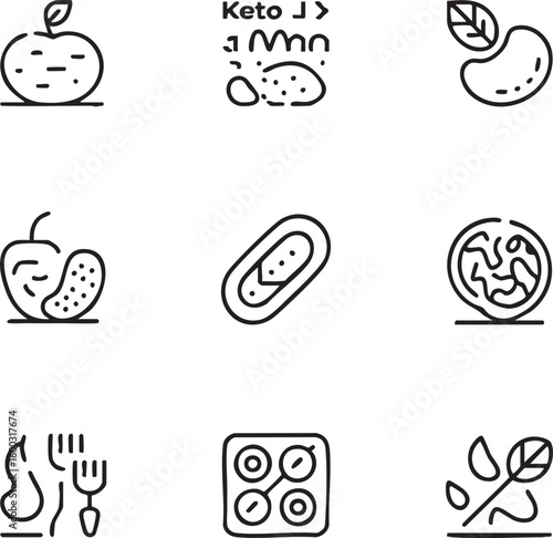 Keto diet vector icon set editable stroke low carb,sugar free,healthy fats,protein,apple,avocado,nuts,supplements,meat,cheese,vegetables,healthy lifestyle,food preparation icon set