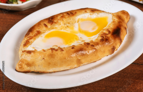 Khachapuri in Adjarian or Adjara khachapuri, boat, national Georgian cuisine, pastry with cheese and egg.Georgian cuisine.