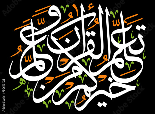 khairukum man taalla mal quran wa allama hu in arabic khattati calligraphy, quranic ayat verses, islamic muslim vector art design, color white isolate on black background wallpaper