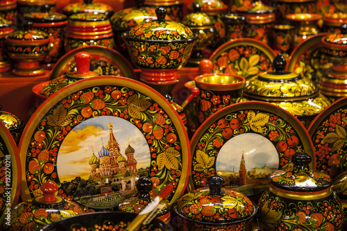 Khokhloma utensils. Kitchen tableware in Russian folk style. Wooden spoons and bowls in bright (red, yellow, golden) colors.