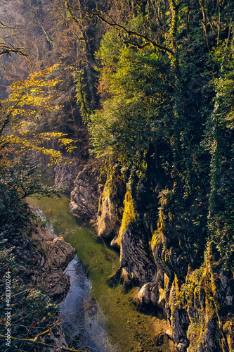 Khosta River flowing through Devils Gate canyon at dusk