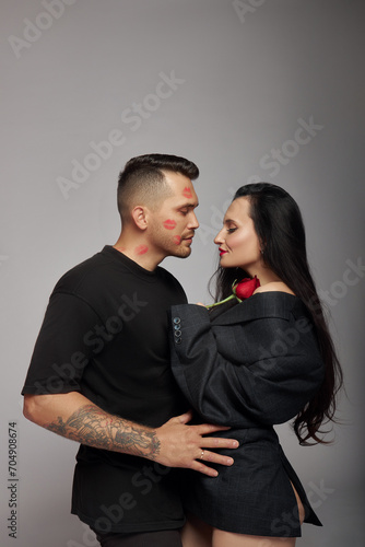 Kisses and hugs of couple in love, lovers. Passionate kisses on man face. Woman with rose flower in her husband hands
