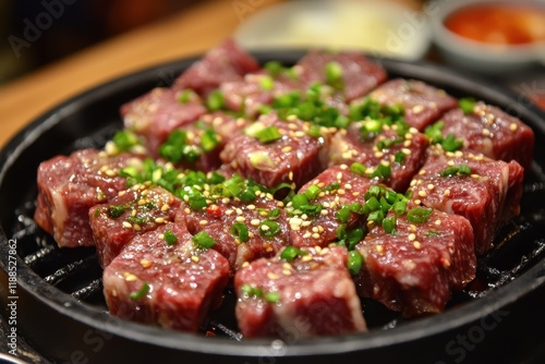 Korean cuisine beef sashimi raw pork belly grilled meats seasonings ribs sides galbitang rice kimchi ssamjang peppers garlic radish sprouts