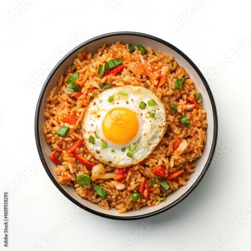 Korean food, Delicious kimchi fried rice served in a corner on a white background, perfect for food photography and culinary presentations.