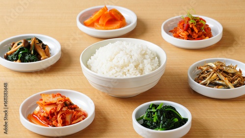 Korean meal with steamed white rice and assorted banchan side dishes, including kimchi, greens, and mushrooms. Top view on wooden table. Authentic and healthy Asian cuisine.