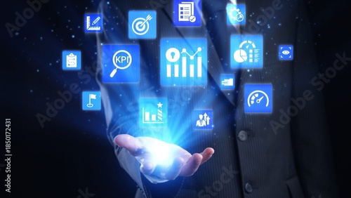 KPI icons show performance metrics, goals, and achievement measurement. KPI helps business track progress, KPI supports management, and KPI improves strategy results. Gist