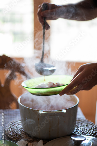 ladle serving hot chickpeas in green glass dish, steaming vegetables on the plate against the light in a rustic space, middle-aged man's hands