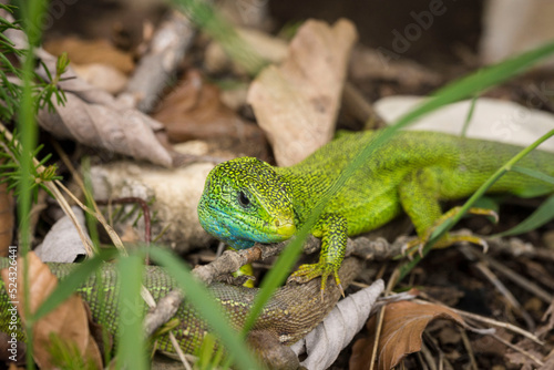 Lagarto Verde Europeo (Lacerta viridis), Parque Nacional de los Lagos de Plitvice, Patrimonio Mundial de la UNESCO, Croacia, europa