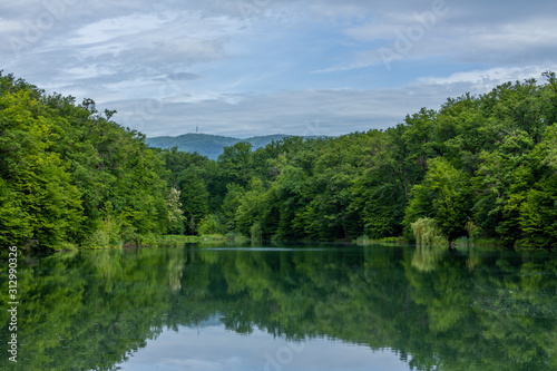 Lake in Maksimir park with green tree reflections and a mountain Medvednica in Zagreb