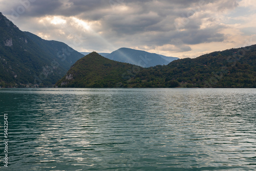 Lake Perucac and Tara mountain with amazing sky at sunset