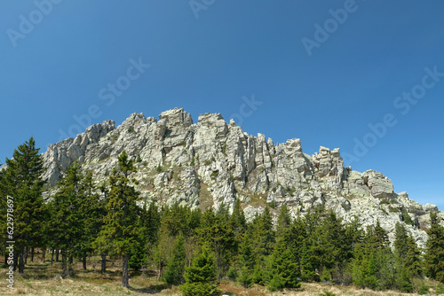 Landscape. Background image. In the foreground is a pine forest. In the background is a rock, blue sky. Summer. Day.