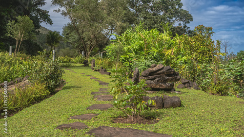 Landscape design of a tropical park. A pedestrian path made of stone sections runs through a green lawn. Flat boulders are stacked in a pyramid. Lush vegetation- bushes, trees. Blue sky, clouds.