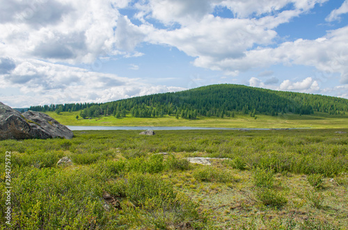 Landscape of taiga against the background of high mountains among lake Altai in Russia