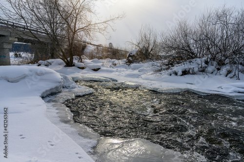 Landscape with a river. An unfrozen fast flowing river on a frosty winter day. The bright midday sun reflects off the icy shores. Bushes and trees frame the scene. Ural (Russia)
