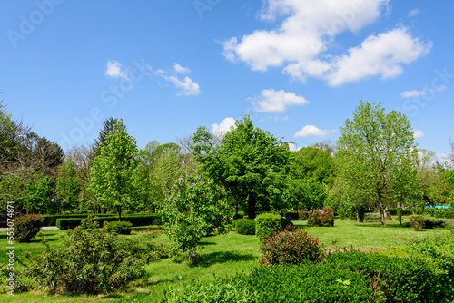 Landscape with vivid green trees and grass in Chindia Park (Parcul Chindia) from Targoviste city in Romania in a sunny spring day with white clouds and blue sky
