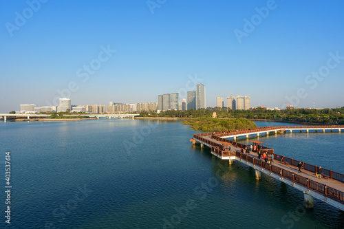Landscapes of Xiamen Wuyuanwan Natural Park and Wuyuan Bridge in distance with water foreground and Xiamen city skyline
