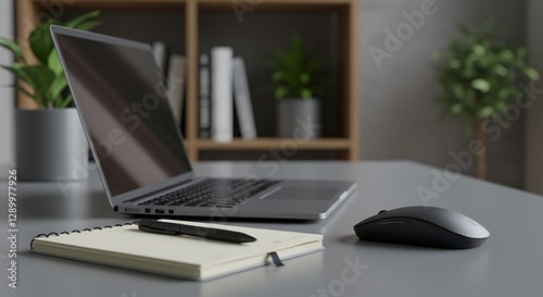 Laptop and Office Workspace with Mouse, Notebook and Pen