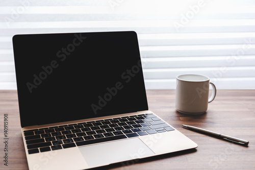 Laptop with blank screen on table