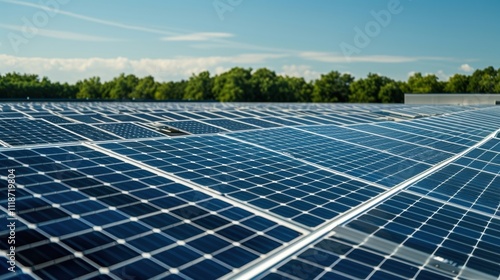 Large array of photovoltaic solar panels capturing sunlight on a rooftop, generating clean and sustainable energy for innovative production processes