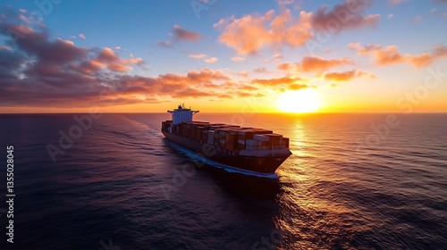 Large cargo ship sailing across the ocean at sunset with dramatic clouds and gentle waves : Generative AI