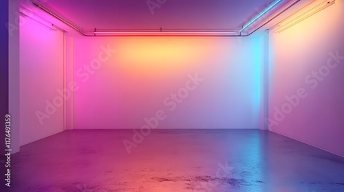 Large room with concrete floors and walls painted in vibrant shades of pink, purple, and blue, illuminated by neon orange ceiling lights, creating a minimalistic, studio-lit space with a hyper-realist