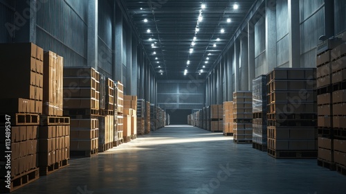 Large warehouse with bright lighting, featuring an aisle lined with stacked pallets and boxes.