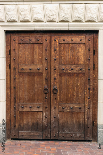 Large weathered wooden double door with metal studs and handles, showing the effects of time and weather, creating a rustic and vintage architectural detail