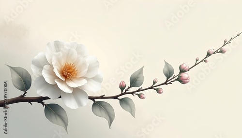 Large white blossom with yellow center blooms on gentle branch. Delicate pink flower buds grow along long stem with subtle green leaves. Elegant floral illustration shows nature beauty, harmony,