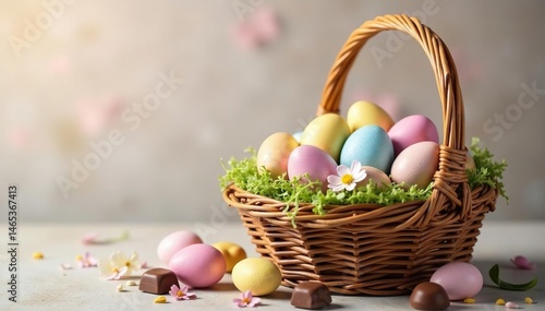 Large wicker basket filled with pastel-colored eggs and chocolate, holiday, colorful