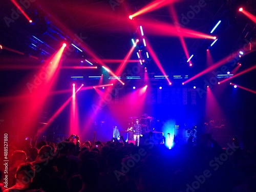 Laser show at live performance. A bunch of music fans in front of a stage. Red lights above the stage. Gig, concert. Strobe lights. Scene. Perform. Live show. Red rays. Spotlight. Festival. Band. Fans