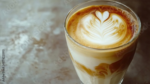 Latte art is poured into a clear glass, capturing the rich texture and color of the latte. The clear glass allows for a beautiful display of the lattes creamy layers with ample copy space.