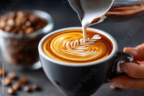 Latte Art Pouring Milk into Coffee Cup with Beans