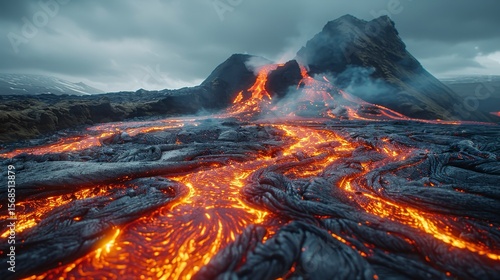 Lava flows down volcanic rock under a cloudy sky with mountains in the background