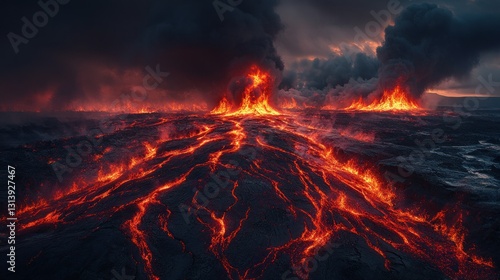 Lava flows, erupting volcano, fiery landscape