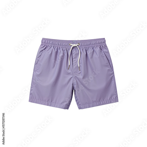 Lavender colored swim trunks with white drawstring displayed on isolated space
