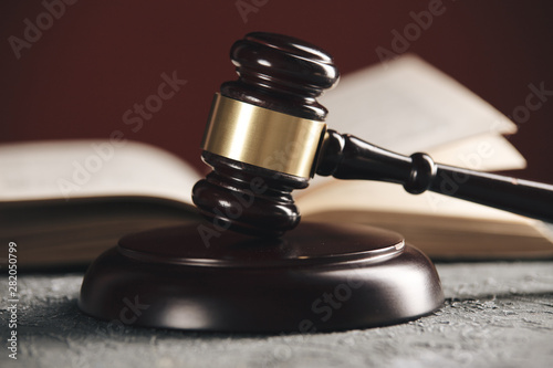 Law concept - Open law book with a wooden judges gavel on table in a courtroom or law enforcement office on black background.