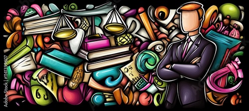 Lawyer with scales and books in colorful doodle pattern on black.