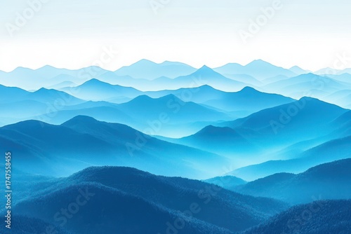 Layered blue mountains fading into the mist under a bright clear sky conveying tranquility and vastness