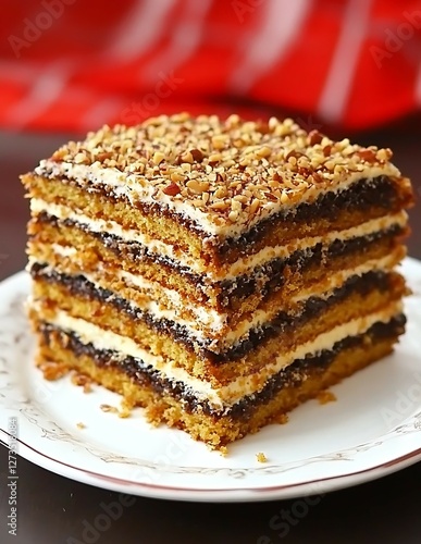 Layered cake with cream dark filling and chopped nuts on a decorative plate.