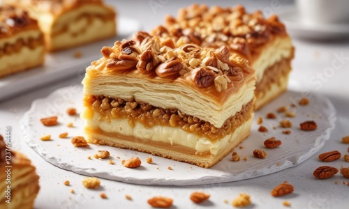 Layered pastry dessert with golden brown pastry and crushed nuts on a white surface, food styling, walnut
